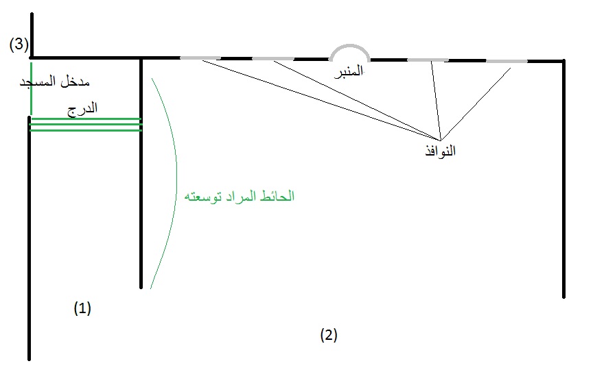 تحول بي المشهد داخل مسجد (لا أعرفه) داخله أبيض اللون به نوافذ أمامية (للقبلة) ولكن في فلسطين هممنا للصلات وذهبت إلى الجهة اليسرى للصف في الجانب (1) وجاءني أحد المصلين وقال لي إن اليهود لا يحبون أن نصلي في هذه الجهة (وهو والمصلين خائفين منهم) رغم ذلك صليت بتلك الجهة ورآني أحد المخبرين داخل المسجد (يهودي نحيف وقصير) وكان ينوي أن يبلغ عني وأدركته وقلت له أنسى ما رأيت ملمحا بيدي اليسرى (أشول) فألح فكررت معة ثانية أنسى مارأيت فنسى وخرج وكأن لدي قوة خارقة (كأنك في أفلام علم الخيال) وقفت في وسط المسجد (2) وأطرح أسئلة في نفسي كيف يمكنني أن أوسع المسجد في أقرب وقت ممكن بدون لفت انتباه اليهود
