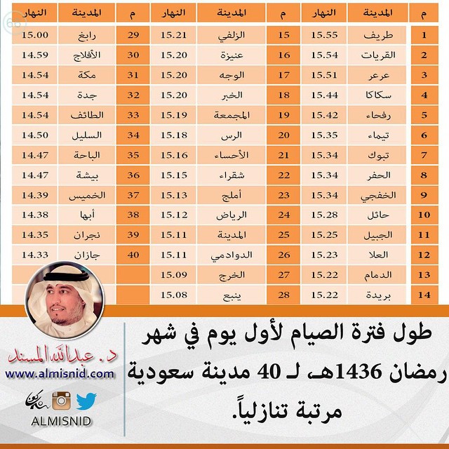 نشر الدكتور عبد الله المسند الأستاذ المشارك بقسم الجغرافيا في جامعة القصيم صورة تشتمل على جدول كامل يوضح عدد ساعات الصيام في 40 مدينة في المملكة. ونشر الدكتور المسند عبر حسابه على تويتر الجدول الذي يوضح طول فترة الصيام لأول يوم في شهر رمضان 1436 هـ.